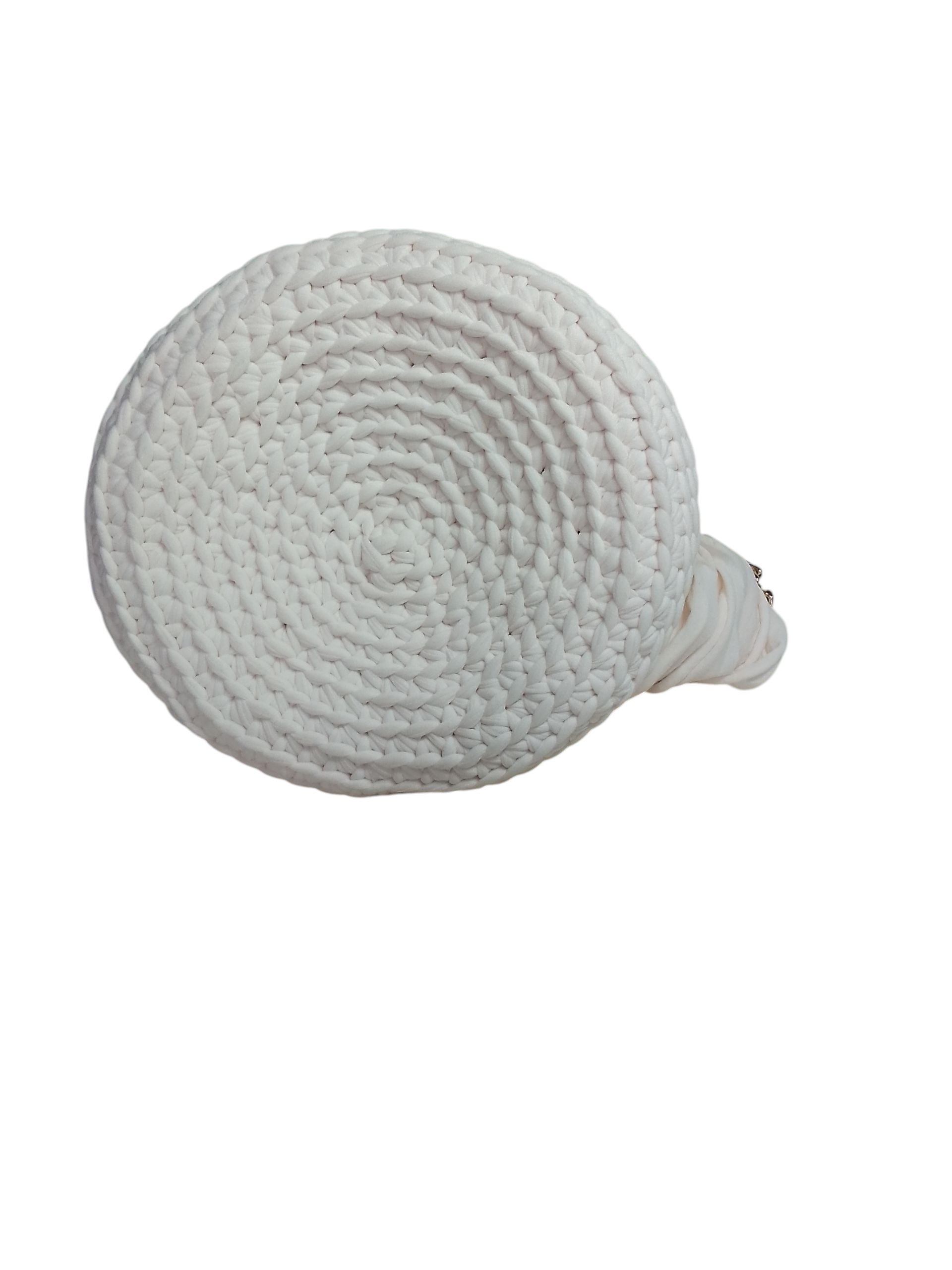 Confeccionado a mano en trapillo pluma y tejido con un punto que aporta textura y distinción.