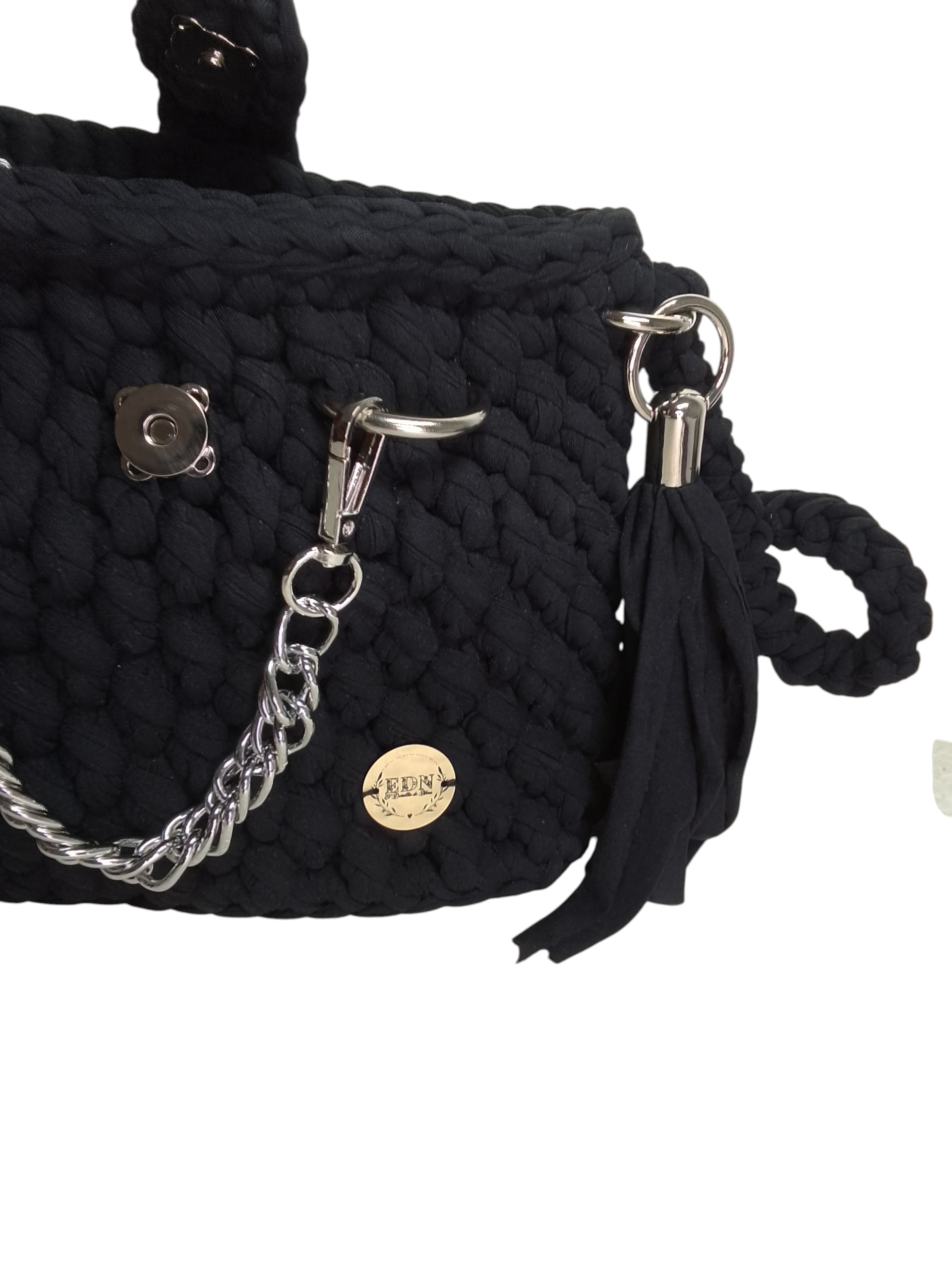 El bolso incluye un asa para mano en color plateado, una correa tejida de unos 96cm para el hombro o bandolera y su borla.