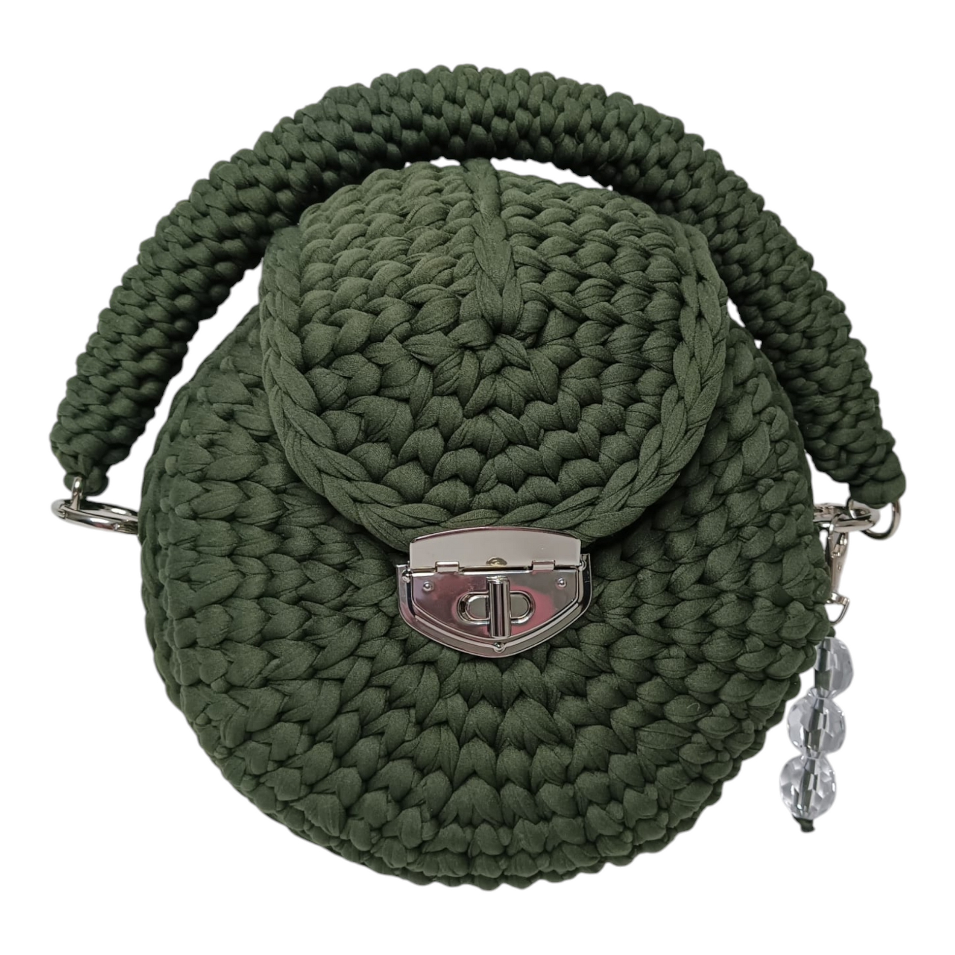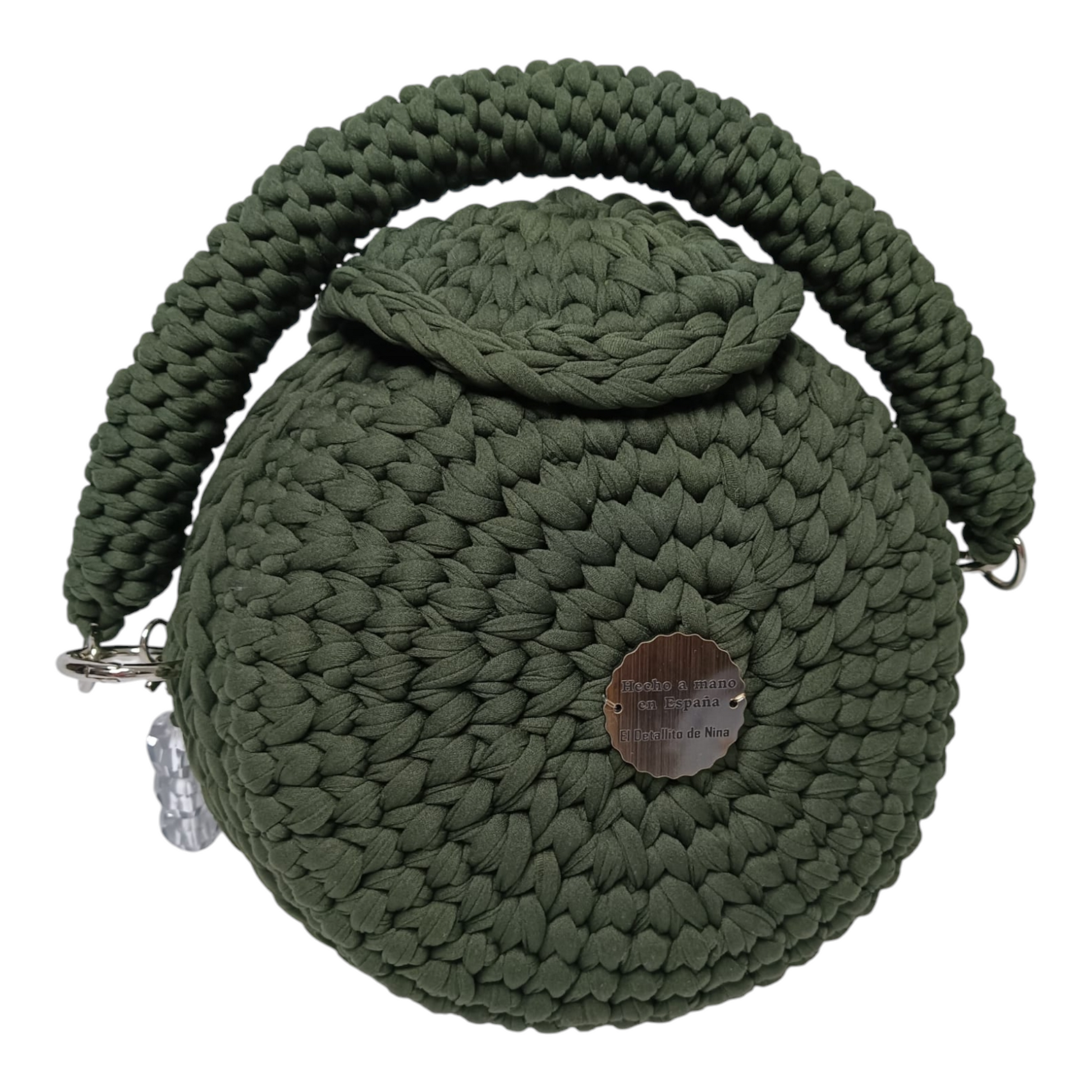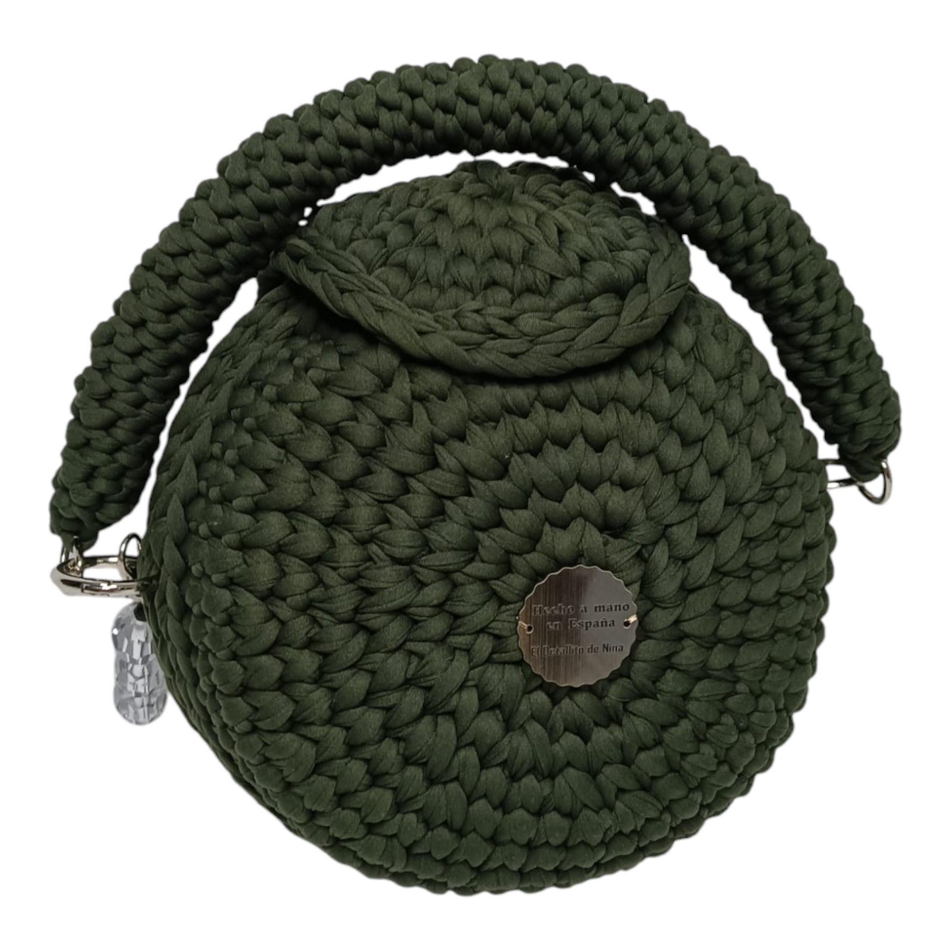 Nuestro bolso circular, tejido a mano con trapillo pluma de origen español, es el accesorio perfecto para mujeres que buscan combinar un estilo clásico con un toque de color moderno.